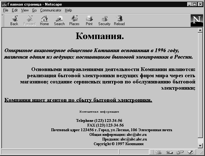 <HTML> <HEAD> <TITLE> Главная страница</TITLE> </HEAD> <BODY> <H1 ALIGN=CENTER>Компания.</H1> <H3 ALIGN=LEFT><I>Открытое акционерное общество Компания осно-ванная в 1996 году, является одним из ведущих поставщиков бытовой электроники в России.</I></H3> <H3 ALIGN=RIGHT><B>Основными направлениями деятельности Компании являются</B>: реализация бытовой электроники ведущих фирм мира через сеть магазинов; создание сервисных центров по обслуживанию бытовой электроники;</H3> <H3><U> Компания ищет агентов по сбыту бытовой электроники.</U></H3> <H5 ALIGN=CENTER><TT>Контактная информация</TT> <DL>Telephone (123) 123-34-56 <DL>FAX (123) 123-34-56 <DL>Почтовый адрес 123456 г. Город, ул Лесная, 106 Электронная почта <DL>Общая информация: abc@abc.su <DL>Продажи: abc@abc.abc.su</DL> Copyright © 1997 Компания</H5> </BODY> </HTML>